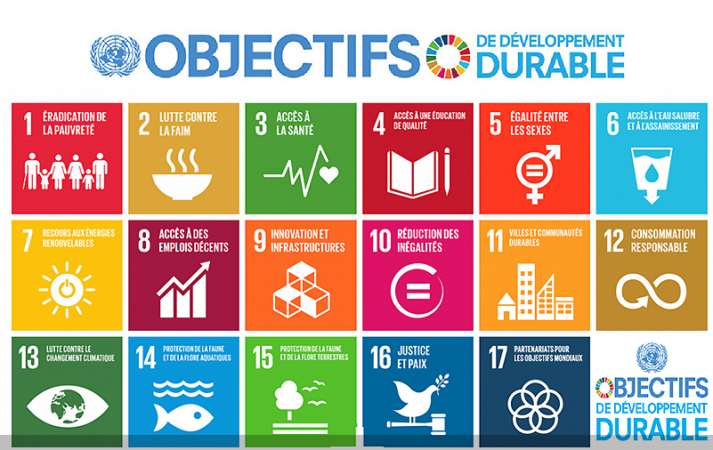 Au cœur de l’Agenda 2030, 17 Objectifs de développement durable (ODD) ont été fixés. Ils couvrent l’intégralité des enjeux de développement dans tous les pays tels que le climat, la biodiversité, l’énergie, l’eau, la pauvreté, l’égalité des genres, la prospérité économique ou encore la paix, l’agriculture, l’éducation, etc.