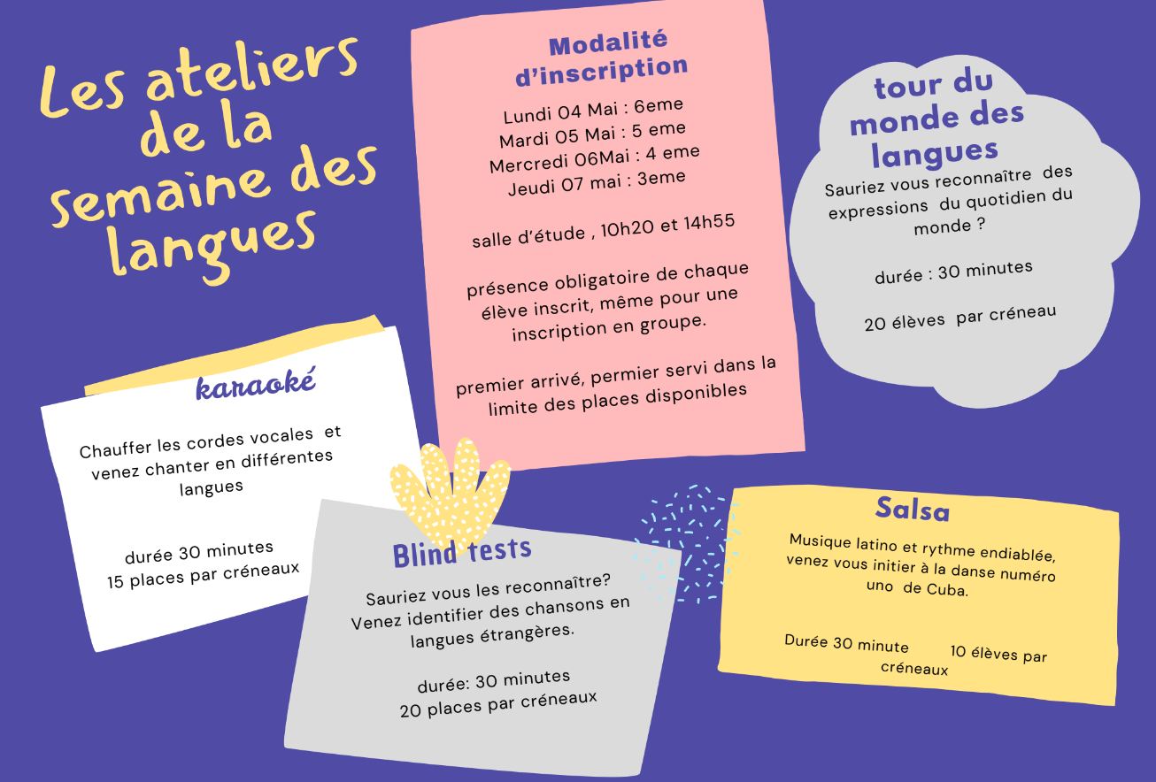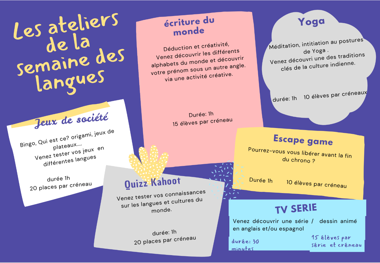 Présentation de la Semaine des Langues à télécharger en pièce jointe et descriptifs des activités proposées / modalités d'inscription en images.